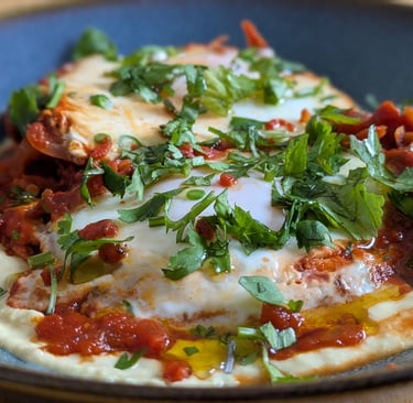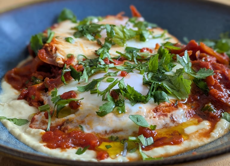 Now, the grand finale! Spread a generous circle of hummus on your plate, gently slide the shakshuka on top, and garnish with the coriander leaves. The creamy hummus meets the rich, spiced eggs—a brunch masterpiece waiting to be devoured.