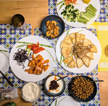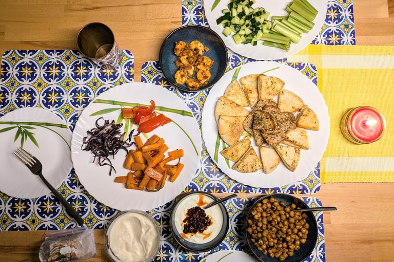 Lay out your crispy pita chips, roasted chickpeas, fresh veggies, roasted veggies, and prawn tapas.